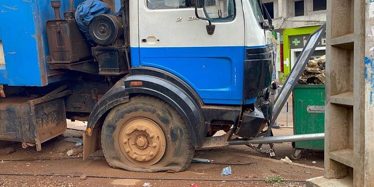 Un camion Benn rempli de sable a raclé et endommagé ce mercredi 31 mai 2023 trois lampadaires nouvellement installés sur la transversale 2 qui relie l’axe Bambéto à Kipé, dans la Commune de Ratoma à Conakry.