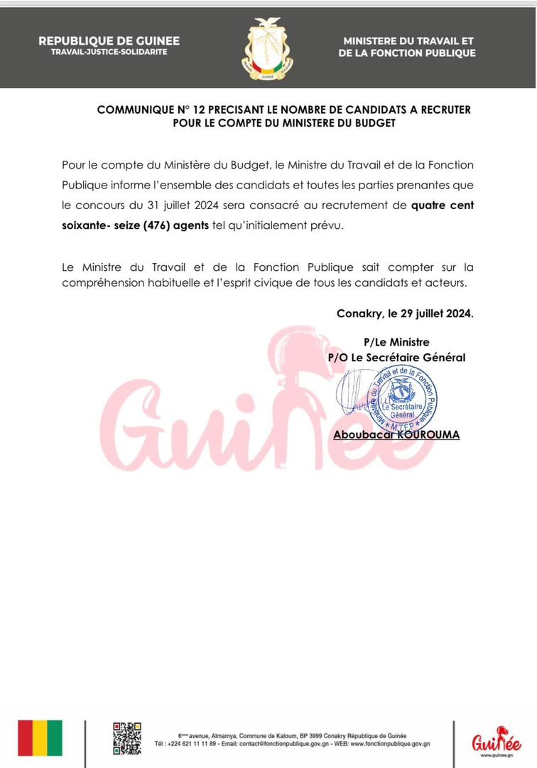 Le Ministère du Travail et de la Fonction publique, a dans un communiqué N°12, informé : “l’ensemble des candidats et de toutes les parties prenantes que le concours du 31 juillet 2024, sera consacré au recrutement de quatre cent soixante seize (476) agents tel qu’initialement prévu.