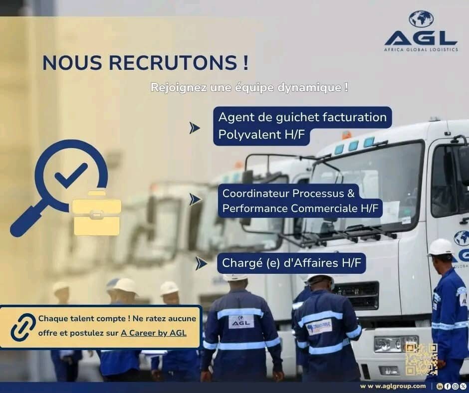 Rejoignez l’aventure AGL Guinée ! Ne manquez pas l’opportunité de construire votre carrière avec nous ! Trois (3) postes à pourvoir immédiatement