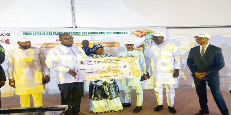 Le Premier Ministre Chef du Gouvernement, Dr Bernard Goumou a présidé ce vendredi 24 février 2023 au Chapiteau By Issa, la cérémonie de remise officielle des financements aux lauréats des compétitions de plans d’affaires dans les filières riz, maïs, pomme de terre, avicole et piscicole dans dix (10) préfectures de la Guinée. Une initiative du Ministère de l’Agriculture et de l’Elevage à travers son projet de Développement Agricole Intégré de Guinée (PDAIG). Un projet financé par la Banque Mondiale (BM) à plus de 16 milliards de francs guinéens. L’objectif, est de promouvoir l’entrepreneuriat des jeunes dans le secteur agricole évoluant en milieu rural en vue d’accroitre la productivité agricole et l’accès au marché pour les producteurs et les petites et moyennes entreprises (PME) agricoles dans les chaines de valeur.