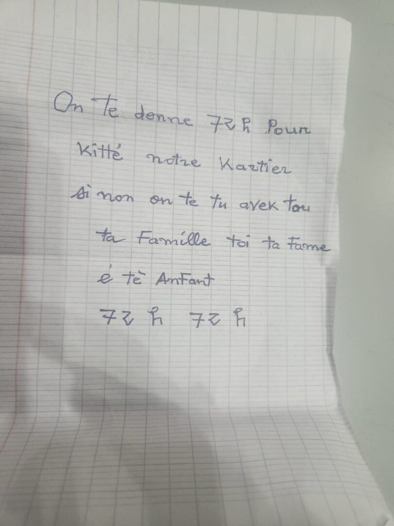 Le Directeur général adjoint du conseil guinéen des chargeurs (CGC), monsieur Macki Guissé et sa famille sont menacés de mort par des inconnus. Sur un papier d’un cahier l’on peut lire : « On Te donne 72 h pour kitté notre Kartier si non on te tu avek tou ta Famille Toi ta fame é tè AnFant 72 h 72 h ».