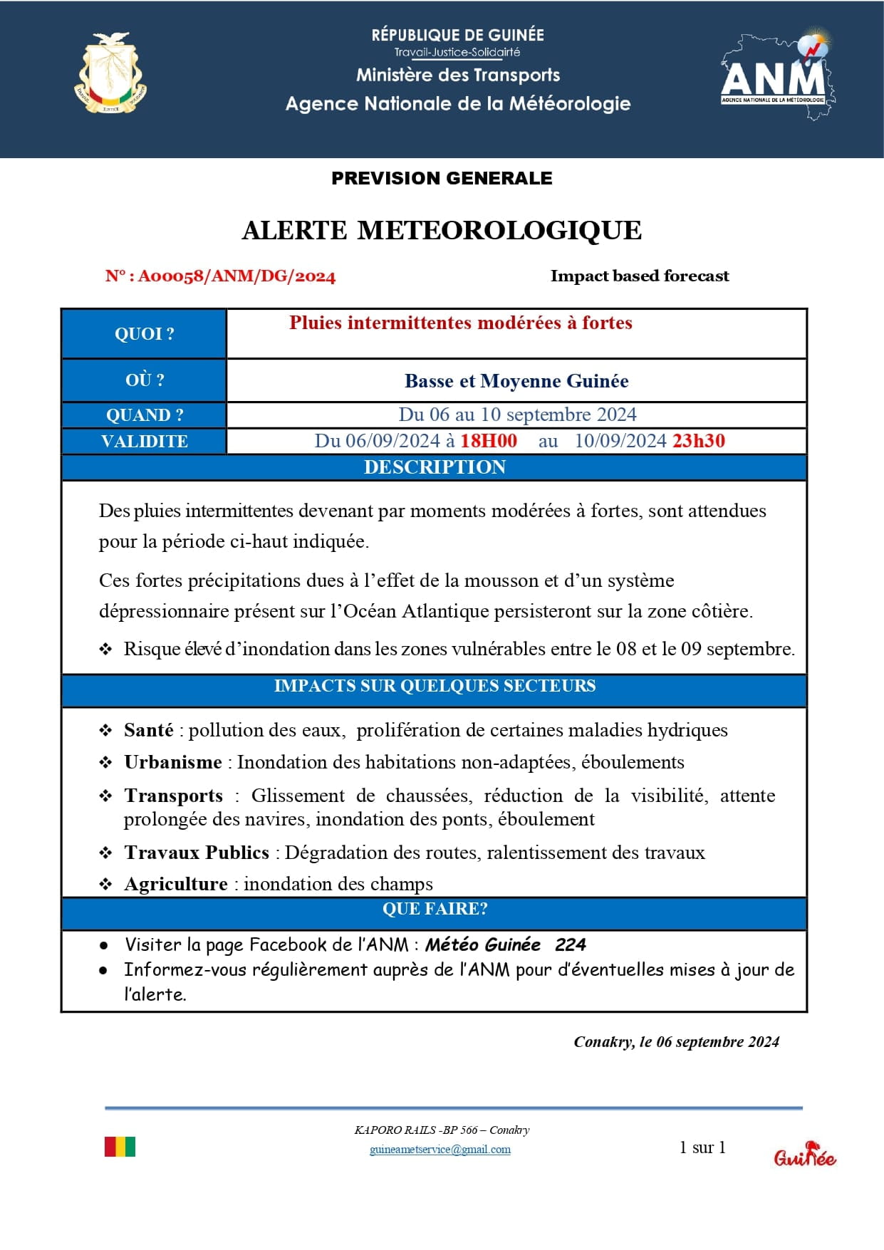 Alerte Météorologique : Risque élevé d’inondations en Basse et Moyenne Guinée du 6 au 10 septembre (ANM) !!!