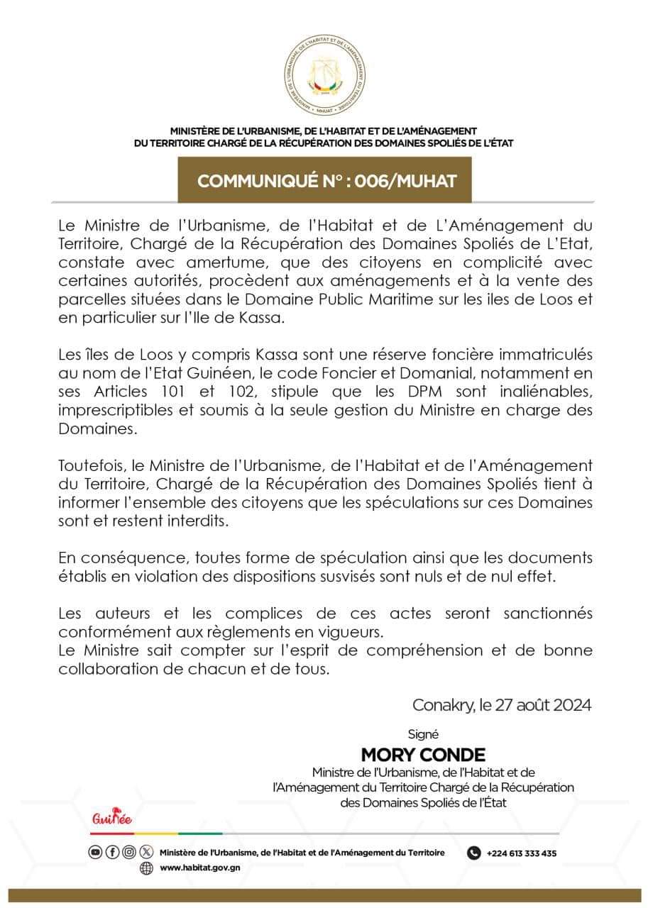 Aménagement des îles de Loos et de kassa, le ministère de l’urbanisme menace les auteurs (Communiqué)!!!