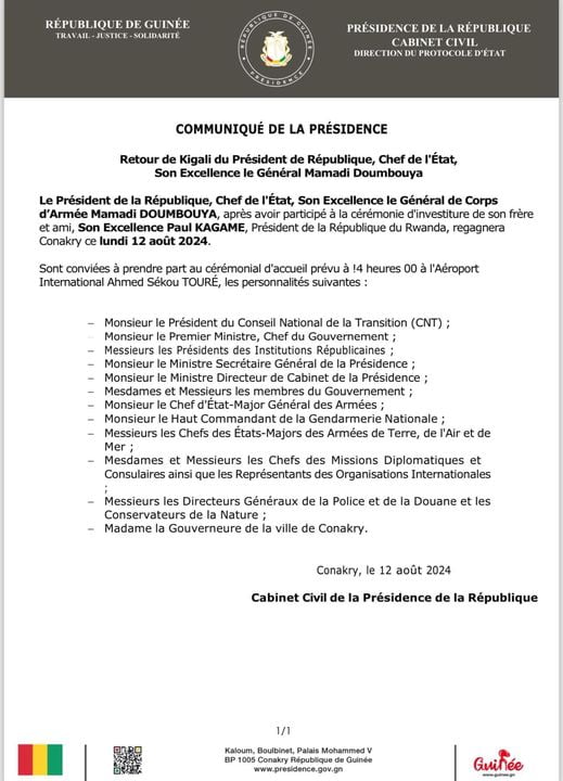 Selon le communiqué de la Présidence de la République, c’est ce lundi 12 août 2024, aux environs de 14 heures que le Président sera accueilli à l’Aéroport Ahmed Sékou Touré.
