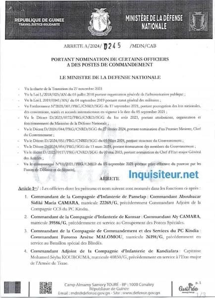 Selon des sites d’informations guinéens, Aly Camara des forces spéciales a été réintégré l’armée guinéenne, avant d’être nommé par le ministre de la défense nationale, l’Ambassadeur Aboubacar Sidiki Camara au poste de commandant de la compagnie d’infanterie de Kamsar. L’arrêté de cette nomination en date du 4 décembre 2024.