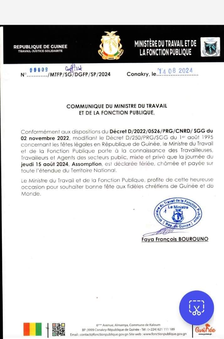 Assomption: La journée du jeudi 15 août déclarée « fériée, chômée et payée » (communiqué)!!!
