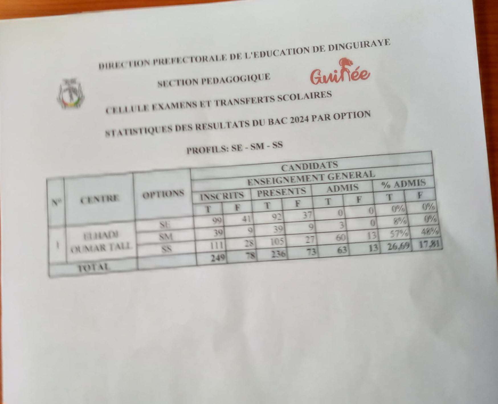 A Dinguiraye, les résultats sont les suivants : Option Sciences Expérimentales 99 candidats dont 41 filles, aucun admis ; Sciences Mathématiques, 39 candidats dont 9 filles, 3 admis ; Sciences Sociales 111 candidats, 60 admis dont 13 filles. Au total 249 candidats dont 78 filles étaient inscrits ; 236 candidats dont 73 ont été évalué et seulement 63 sont déclarés admis dont 13 filles.