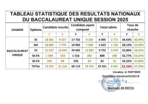 Les résultats du baccalauréat unique session 2025 ont été rendus publics ce samedi 19 juillet 2025. L’annonce a été faite par le ministère de l’enseignement pré-universitaire et de l’alphabétisation. Selon les statistiques, le taux de réussite est de 32,34 %.