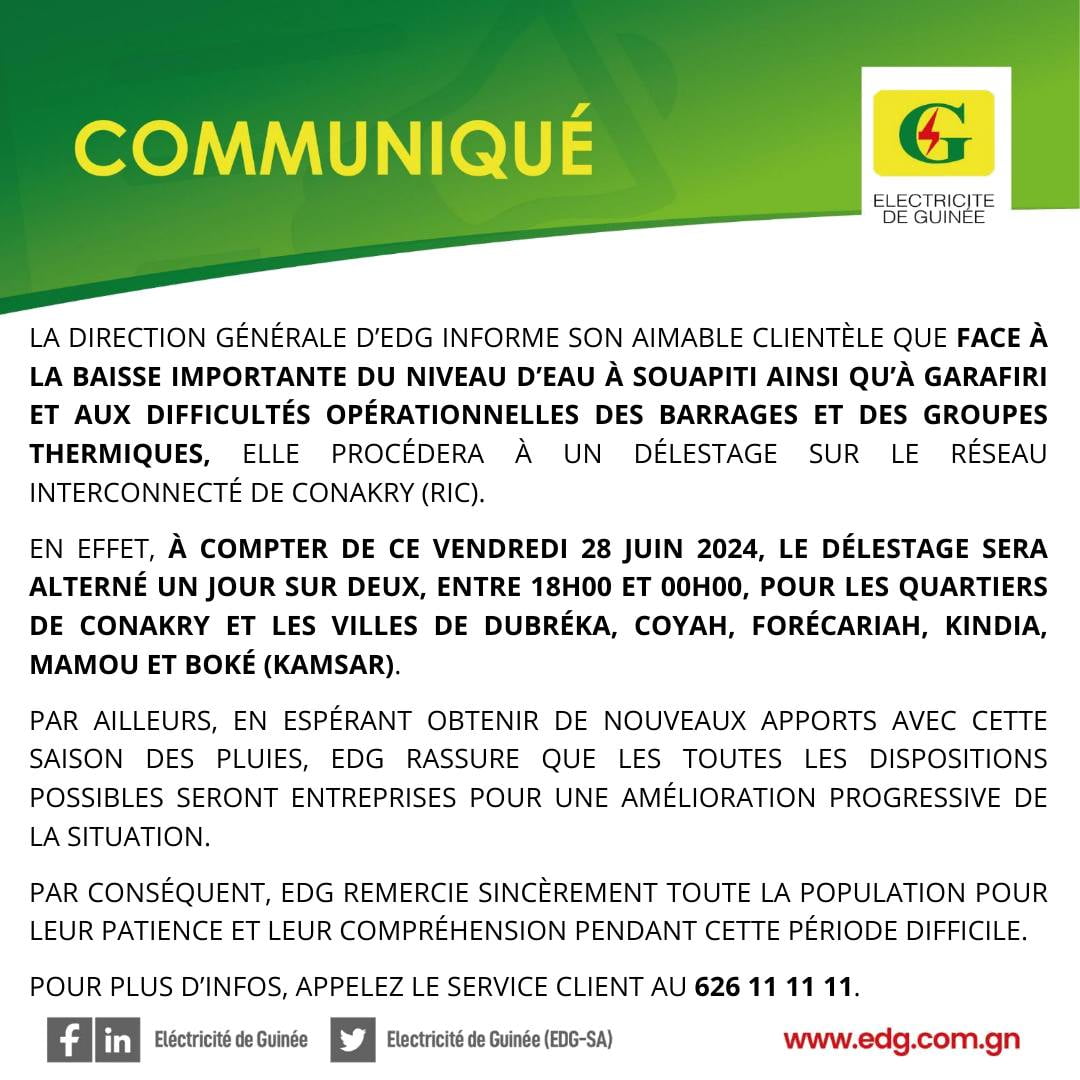 Baisse importante du niveau d’eau aux barrages de Souapiti et Garafiri : Le délestage sera alterné un jour sur deux selon EDG (Communiqué) !!!