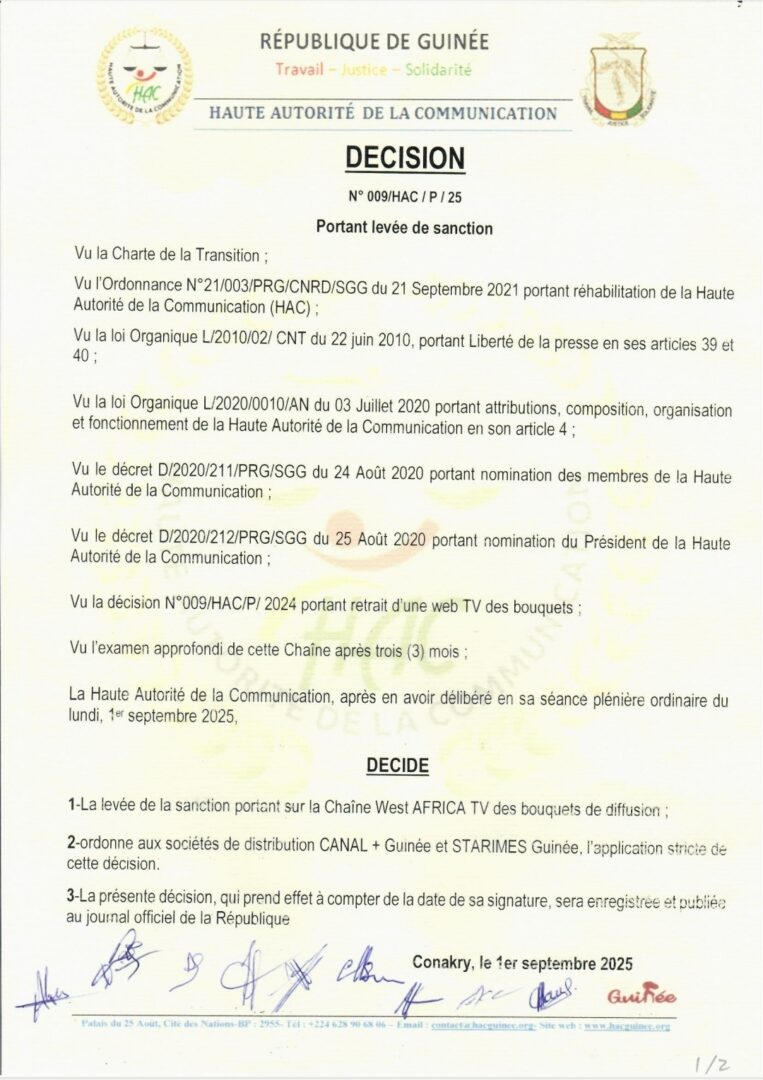 Selon cette institution en charge de reguler les médias en Guinée : « Après un examen approfondi de la chaîne, la Haute Autorité de la Communication, réunie en séance plénière ordinaire le lundi 1er septembre 2025, décide de lever la sanction visant West AFRICA TV sur les bouquets de diffusion. Elle ordonne aux sociétés CANAL+ Guinée et Startimes Guinée de se conformer strictement à cette décision » a-t-elle informé.