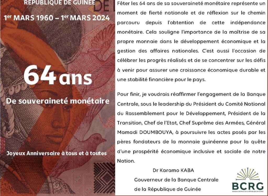 Ce 1er mars 2024, la monnaie nationale guinéenne GNF/Francs Guinéens fête ses 64 ans d’existence. A cette occasion, le Gouverneur de la Banque Centrale de la République de Guinée (BCRG) Karamo Kaba a adressé un message à l’endroit du Peuple de Guinée, de l’Afrique et du monde. Dans ce message rendu public ce vendredi 1er mars 2024, le Gouverneur parle d’une fierté nationale et d’un leadership des nouvelles autorités de la transition sous le Général Mamadi Doumbouya, Président de la Transition.