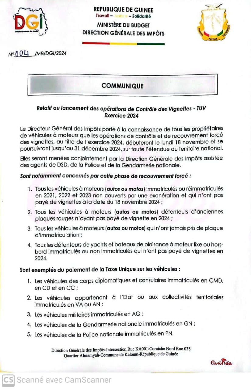 La Direction Générale des Impôts a dans un communiqué en date du mercredi 13 novembre 2024, annoncé le début des opérations de contrôle des vignettes de la Taxe Unique sur les Véhicules (TUV) de l’exercice 2024.