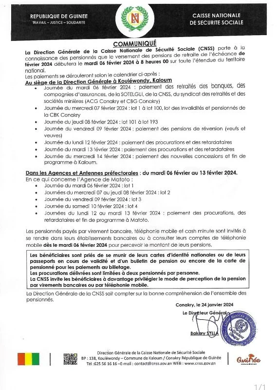La Direction Générale de la Caisse Nationale de Sécurité Sociale (CNSS) a dans un communiqué, annoncé la date du mardi 06 février 2024, début de versement des pensions de traite de l’échéance du mois de février 2024. Et que les paiements se déroulement selon le calendrier établi à cet effet à partir de 8 heures 00 sur toute l’étendue du territoire national.