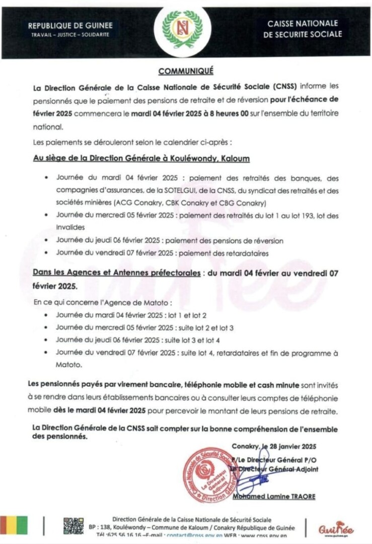 La Direction Générale de la Caisse Nationale de Sécurité Sociale (CNSS), a dans un communiqué en date du mardi 28 janvier 2025, annoncé que la date du mardi 4 février 2025, débutera le versement des pensions de traite de l’échéance du mois de février 2025. Et que les paiements se dérouleront sur toute l’étendue du territoire national à partir de 8 heures 00, selon le calendrier établi à cet effet.