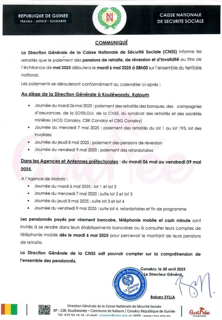 La Direction Générale de la Caisse Nationale de Sécurité Sociale (CNSS), a dans un communiqué en date du mercredi 30 avril 2025, informé les retraités que le paiement des pensions de retraite, de réversion et d’invalidité au titre de l’écheance de mai 2025 débutera le mardi 6 mai 2025, à 8H00 sur l’ensemble du territoire national. Et que les paiements se dérouleront selon le calendrier établi à cet effet.