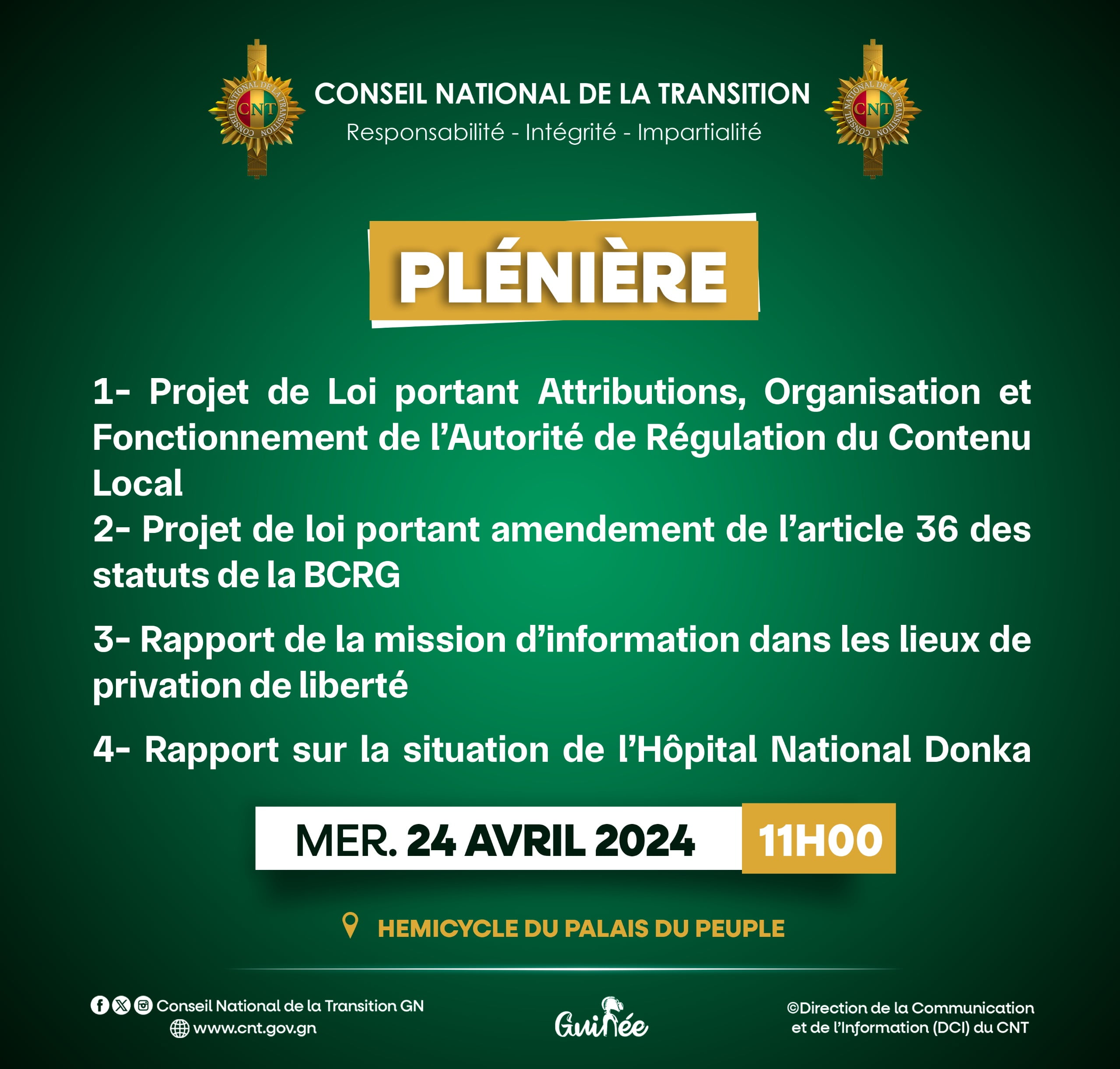Ce mercredi 24 avril 2024, les conseillers nationaux du CNT sont conviés à une session plénière à l’Hémicycle. Au cours de laquelle, ils examineront deux (2) projets de lois et deux (2) rapports de missions parlementaires.