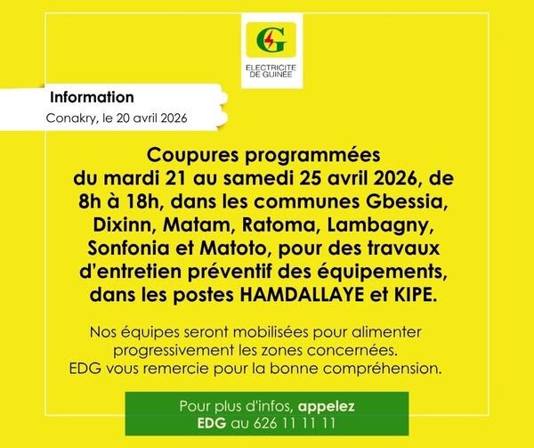 La société d’électricité de Guinée ‘’EDG’’, a informé son aimable clientèle qu’une coupure du courant est programmée pour sept (7) communes de la capitale Conakry.