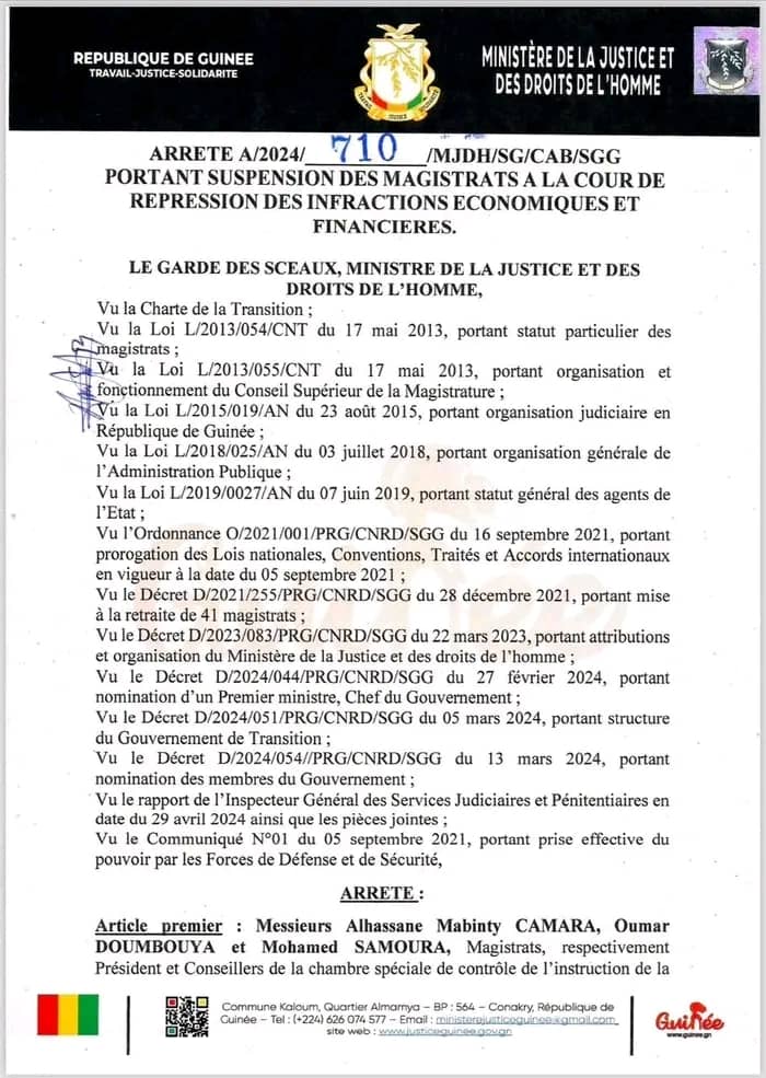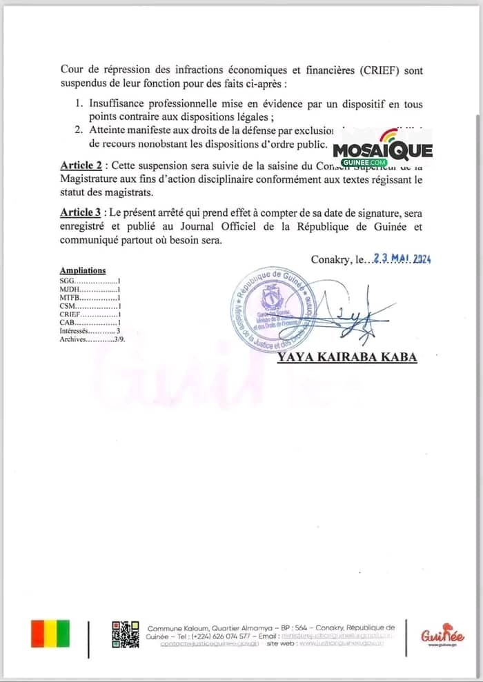 Le Ministre de la Justice, des Droits de l’Homme, Yaya Kairaba Kaba a dans un arrêté N°710, annoncé la suspension de leurs fonctions trois (3) magistrats de la Cour de Répression des Infractions Economiques et Financières (CRIEF).