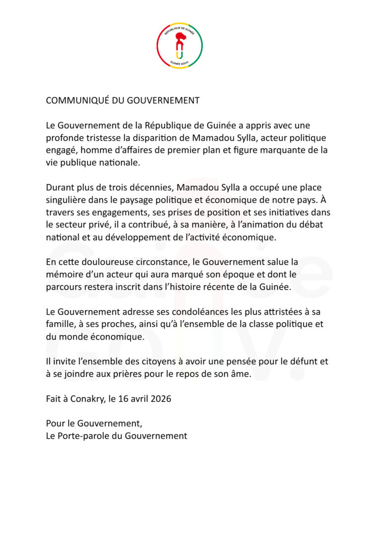 Le Gouvernement de la République de Guinée a appris avec une profonde tristesse la disparition de Mamadou Sylla, acteur politique engagé, homme d’affaires de premier plan et figure marquante de la vie publique nationale.