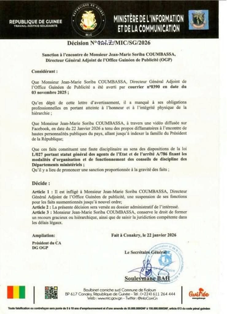 Le ministère de l’Information et de la Communication a rendu publique une décision officielle portant sanction disciplinaire à l’encontre de monsieur Jean Marie Soriba Koumbassa, directeur général adjoint de l’Office Guinéen de Publicité et d’Affichage.