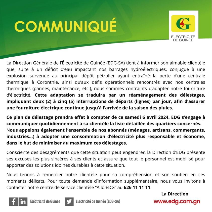 Déficit d’eau aux barrages hydroélectriques, la Direction de l’EDG annonce un réaménagement du programme de délestage (Communiqué) !!!