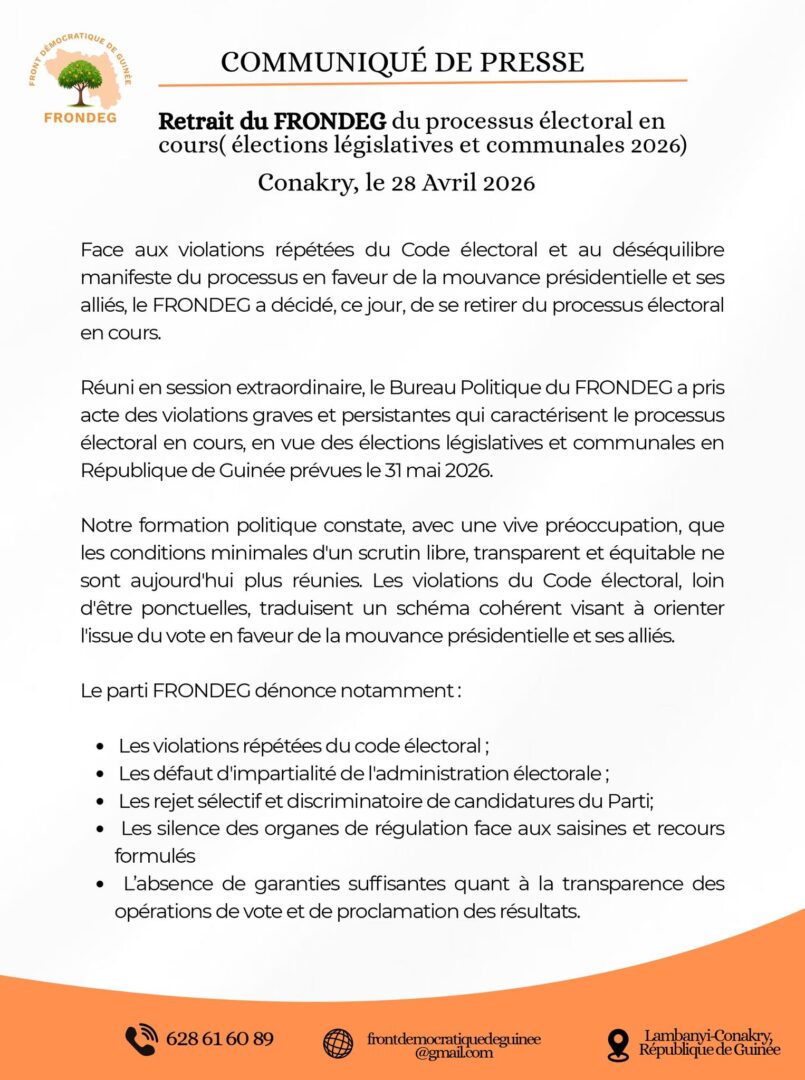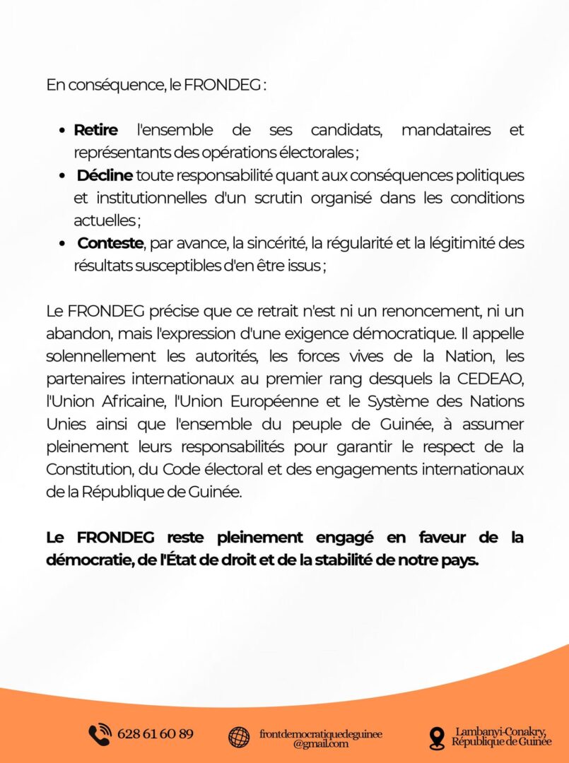 Le Front Démographique de Guinée (FRONDEG), que dirige Abdoulaye Yero Baldé a annoncé son retrait du processus électoral en République de Guinée.