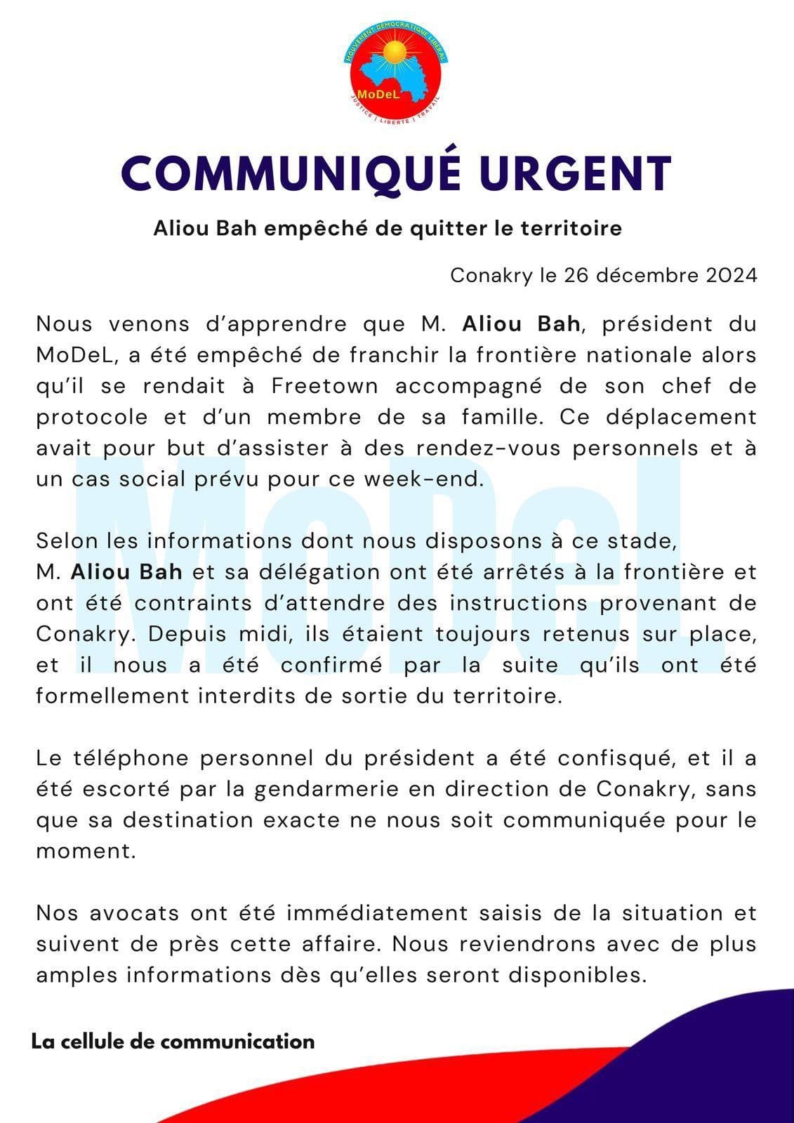 : « Nous venons d’apprendre que M. Aliou Bah, président du MoDeL, a été empêché de franchir la frontière nationale alors qu’il se rendait à Freetown accompagné de son chef de protocole et d’un membre de sa famille. Ce déplacement avait pour but d’assister à des rendez-vous personnels et à un cas social prévu pour ce week-end.