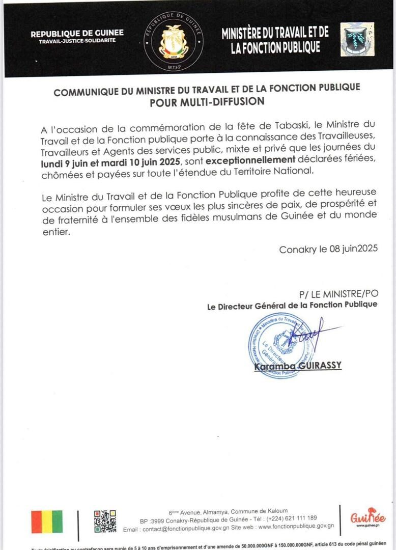 Dernière minute: les journées de lundi et mardi déclarées fériées « exceptionnellement » (Communiqué)