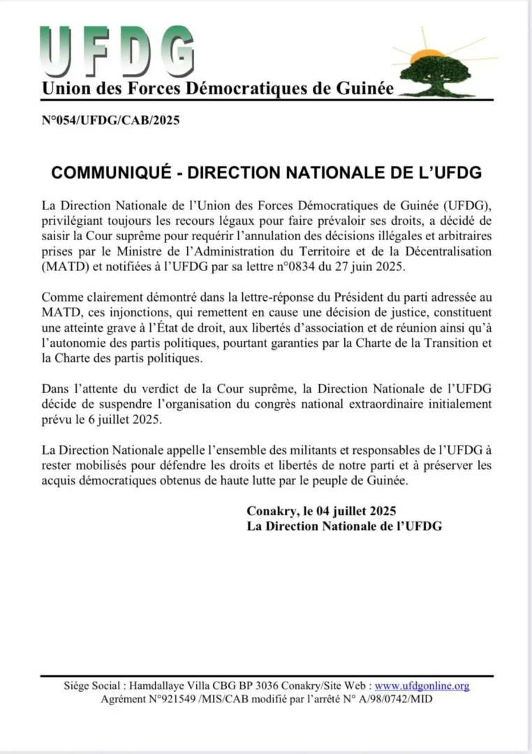Initialement prévu le dimanche 6 juillet 2025, le parti de l’opposition guinéenne Union des Forces Démocratiques de Guinée (UFDG) a annoncé la suspension de la tenue du congrès dudit parti. L’information a été donnée ce vendredi 4 juillet 2025, par la Direction nationale de l’UFDG, dans un communiqué sans signature encore moins de cachet. Mais le logo et le numéro de référence était visible.