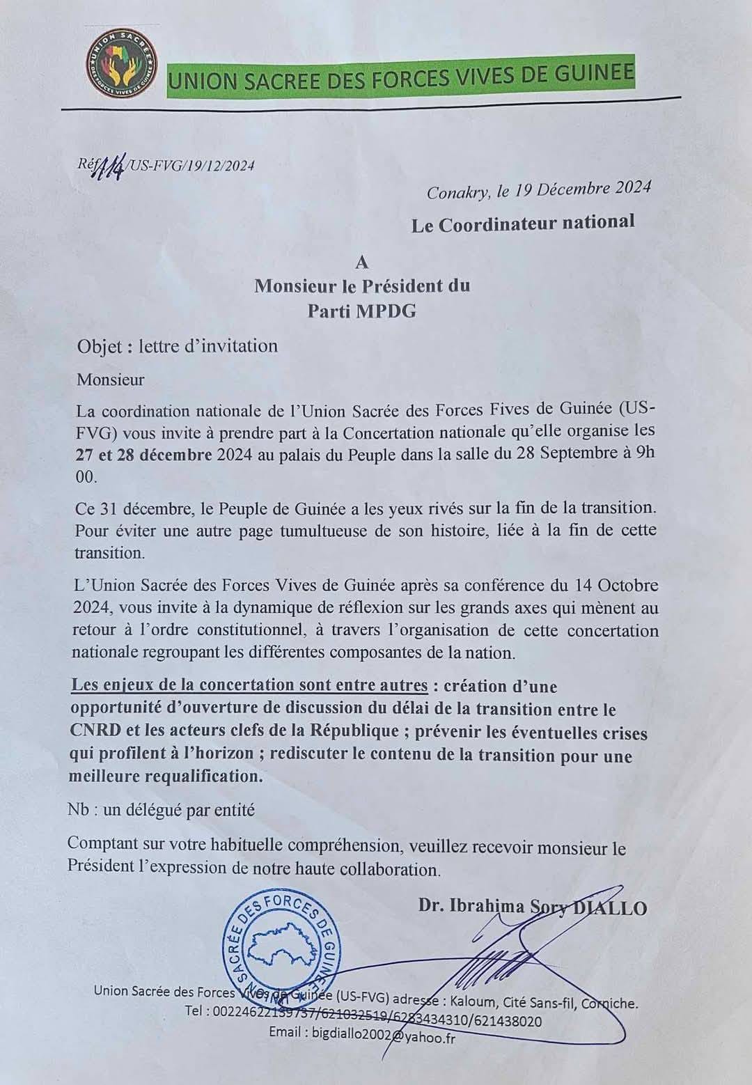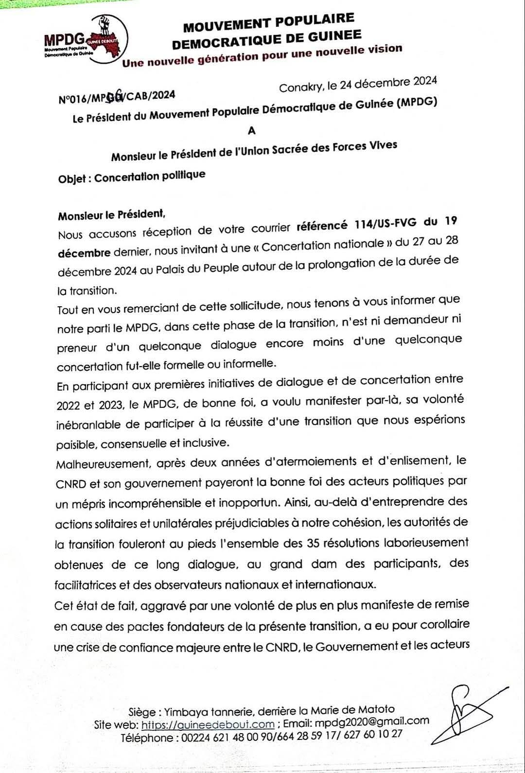 Le parti MPDG de Siaka Barry a été invité à une « concertation nationale » autour de la prolongation de la transition par la coalition politique dénommée « UNION SACRÉE » les 27 et 28 décembre 2024. Mais cette invitation a été rejetée par le MPDG. Ce parti déplore entre autres ‘’le non-respect des recommandations des précédents dialogues, les actions solitaires et unilatérales du CNRD et de son gouvernement, et la remise en cause des pactes fondateurs de la présente transition’’. Par la même occasion, le parti annonce la suspension de sa participation à toutes les initiatives de concertation et de dialogue relatives à la transition, jusqu’à nouvel ordre.