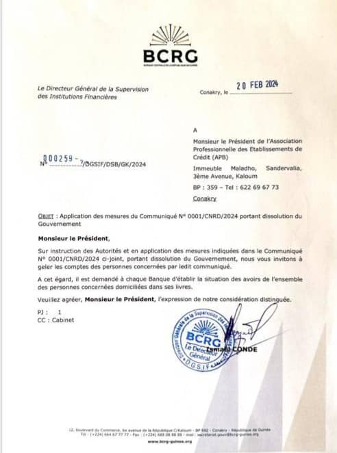 Dans un courrier en date du mardi 20 février 2024, adressé au président de l’Association Professionnelle des Etablissements de Crédit (APB), le Directeur Général de la Supervision des Institutions Financieres de la BCRG, a demandé le gel des comptes bancaires des personnes concernées.