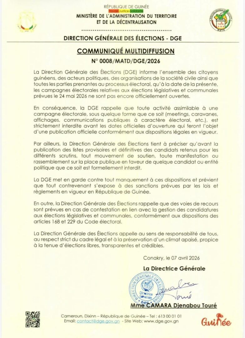 ACTUALITÉ Double scrutin en Guinée : les dates officielles de la campagne fixées au 24 avril prochain (décret) 8 avril 2026