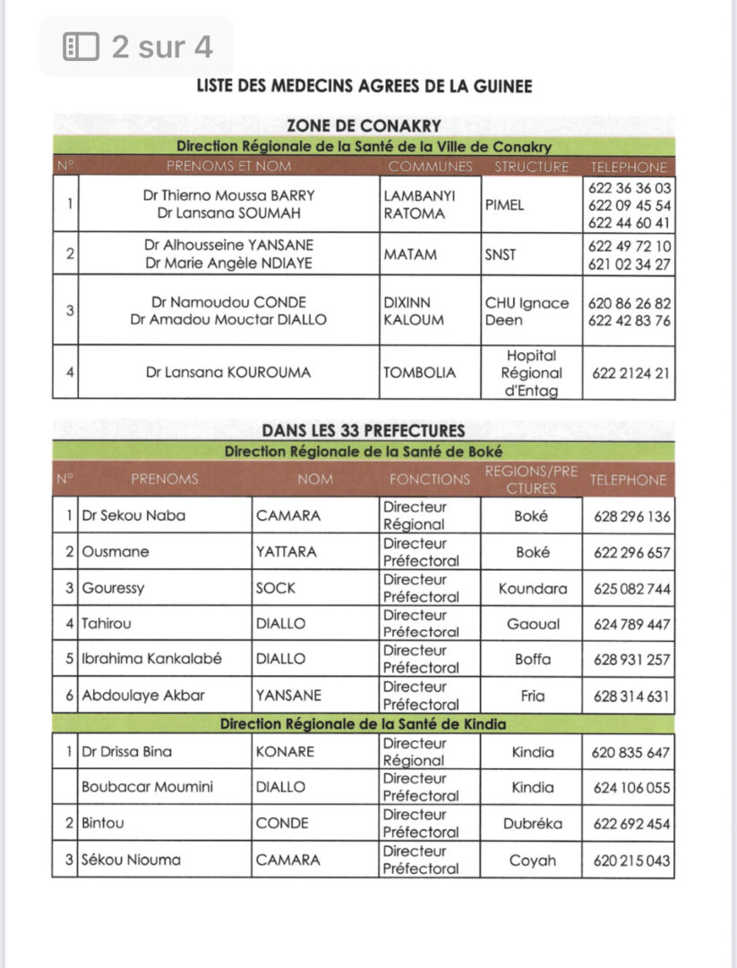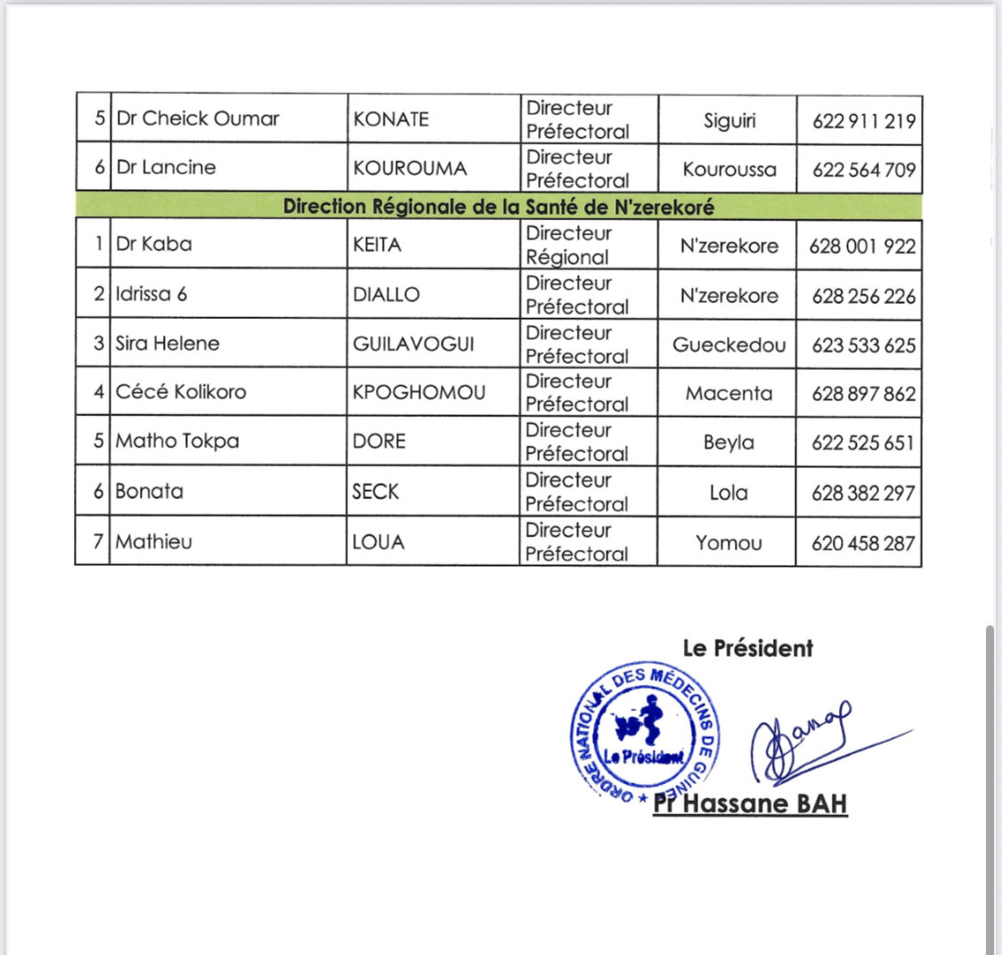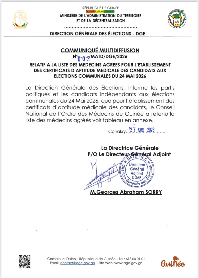 La Direction Générale des Élections, informe les partis politiques et les candidats indépendants aux élections communales du 24 Mai 2026, que pour l’établissement des certificats d’aptitude médicale des candidats, le Conseil National de l’Ordre des Médecins de Guinée a retenu la liste des médecins agréés voir tableau en annexe.
