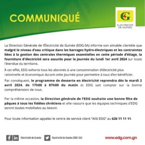 𝐂𝐨𝐦𝐦𝐮𝐧𝐢𝐪𝐮é 𝐄𝐃𝐆 : EDG informe son aimable clientèle que la fourniture d’électricité sera assurée pour la journée du 1er avril 2024 sur tout le système interconnecté de Conakry (RIC).