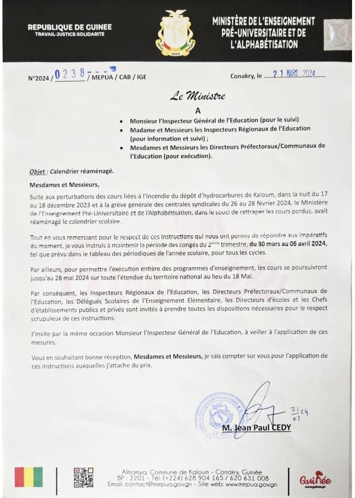 Une note N°0238/MEPUA/CAB/IGE, en date du 21 mars 2024, du Ministère de l’Enseignement Pré-universitaire et de l’Alphabétisation annonce le réaménagement du calendrier des examens nationaux en République de Guinée. Une décision prise et justifiée par le nouveau ministre M. Jean Paul Cedy, adressée à monsieur l’inspecteur général de l’éducation pour le suivi et à madame et messieurs les inspecteurs Régionaux de l’Education pour information et suivi et Mesdames et messieurs les Directeurs Préfectoraux/Communaux de l’Education pour exécution.