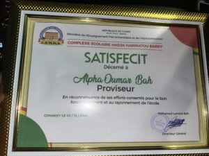 Poursuivant son discours d’adieux, il a saisi l’occasion pour exprimer ‘’sa profonde gratitude’’ envers le fondateur de l’établissement. « En ce moment empreint d’émotion, je tiens à exprimer ma profonde reconnaissance envers le regretté fondateur de cette institution, El Hadj Mamadou Dian Barry qui m’a fait entièrement confiance, et dont la vision et le dévouement ont été les fondements de cet établissement. Son héritage continue de nous guider, et bien que son absence physique soit ressentie, sa présence spirituelle perdure dans chaque salle de classe et dans chaque réussite de nos élèves. Mes pensées vont également à la famille de la fondation, qui a soutenu et perpétué la mission éducative avec un engagement indéfectible » a-t-il ajouté.