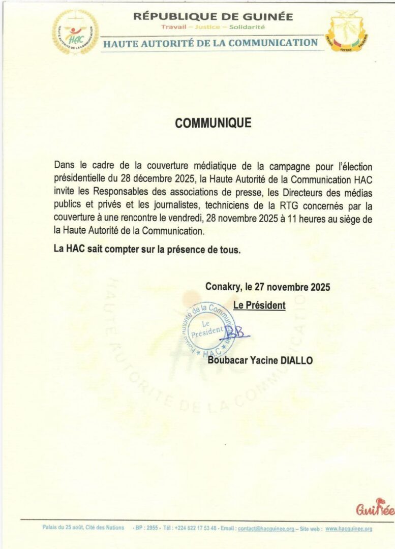 La Haute Autorité de la Communication (HAC), a dans un communiqué rendu public ce jeudi 27 novembre 2025, annoncé une invitation des responsables des associations de presse, les directeurs des médias publics et privés et les journalistes, techniciens de la RTG concernés par la couverture de l’élection présidentielle. La rencontre est prévue le ce vendredi 28 novembre 2025 à partir de 11 heures au siège de cette institution sis à Kaloum.
