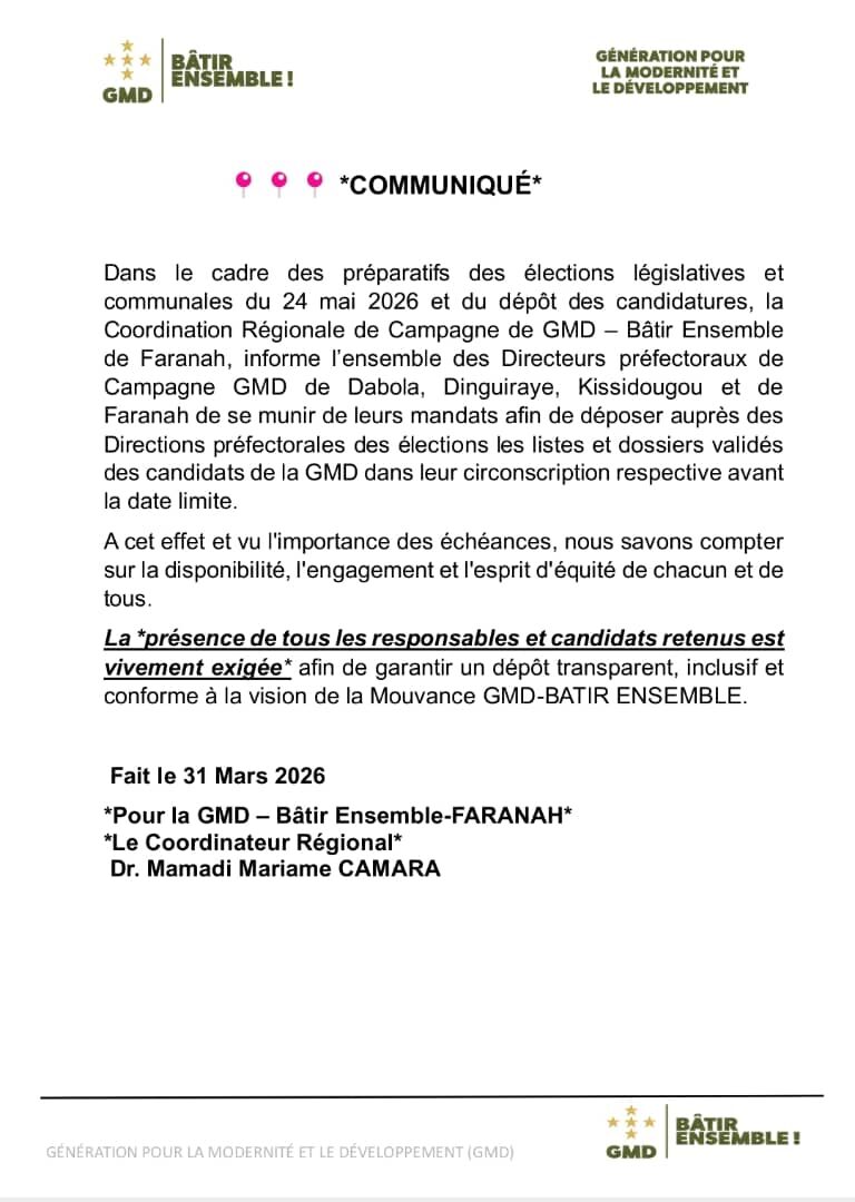 Selon le communiqué officiel daté du 31 mars 2026, les Directeurs préfectoraux de Campagne de Dabola, Dinguiraye, Kissidougou et Faranah doivent se présenter munis de leurs mandats pour déposer auprès des Directions préfectorales des élections les listes et dossiers validés des candidats retenus avant la date limite.