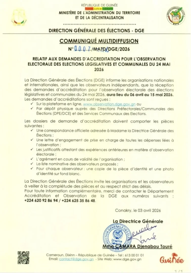 La Direction générale des élections (DGE) a annoncé l’ouverture des demandes d’accréditation pour l’observation des élections législatives et communales prévues le 24 mai 2026. La période de dépôt des dossiers s’étend du 6 avril au 15 mai 2026.