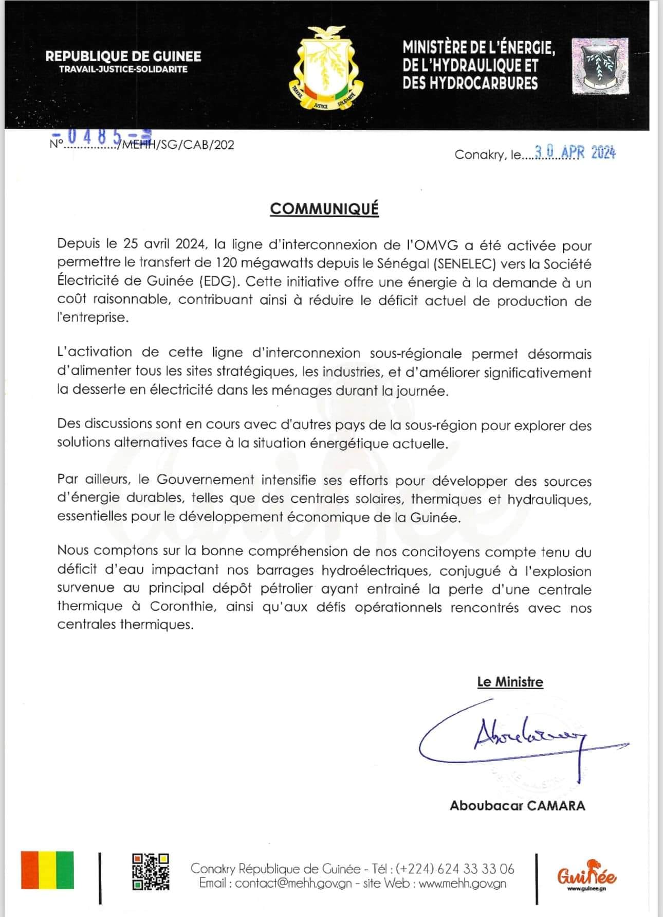 Le Ministère de l’Energie, de l’Hydraulique et des Hydrocarbures, a dans un communiqué en date du 30 avril 2024, informe que depuis le 25 avril, la ligne d’interconnexion de l’OMVG a été activée pour permettre le transfert de 120 mégawatts depuis le Sénégal (SENELEC) vers la société Electricité De Guinée (EDG).