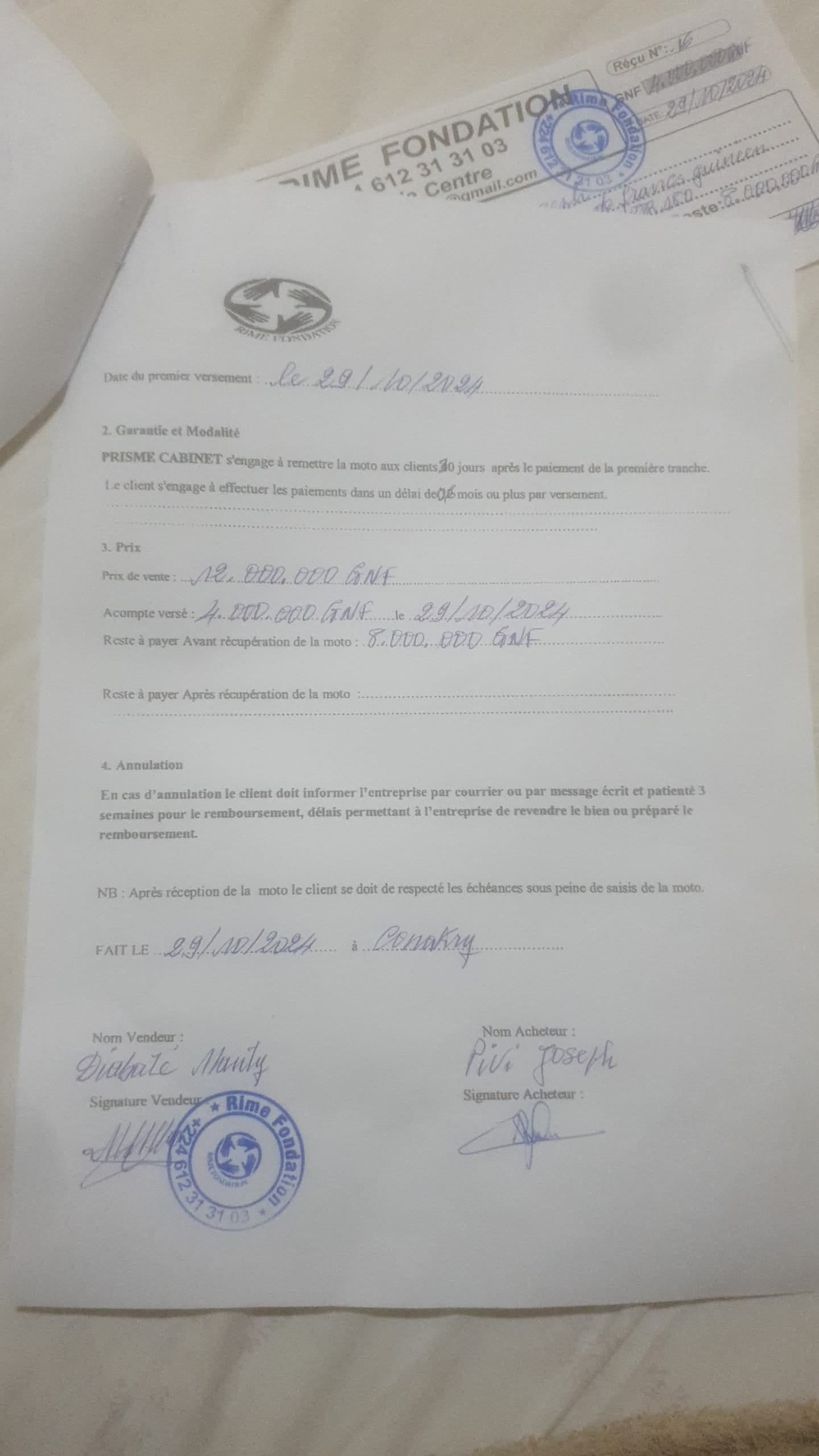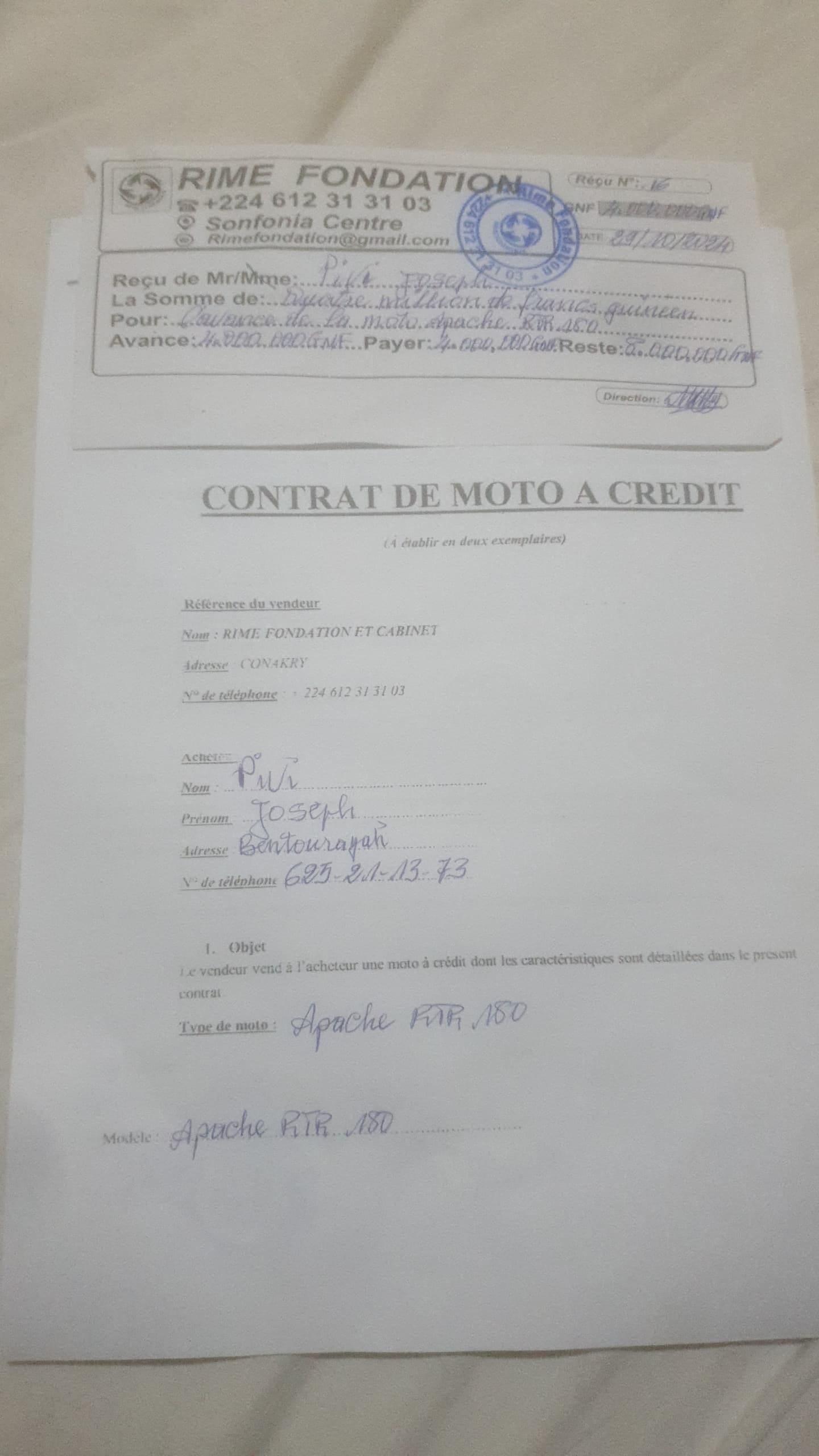 « En réalité, tout a commencé par mon envie d’acheter une moto Apache qui me permettrait d’aller travailler, étant donné que je vis un peu loin de la ville. C’est à ce moment-là que j’ai découvert une publication sur Facebook de ‘RIME FONDATION’ qui affirme qu’elle aide les jeunes à acheter des motos moins coûteuses, avec seulement une avance. Je me suis déplacé jusqu’à leur bureau, à proximité de l’Université Général Lansana Conté. C’est là que j’ai rencontré la dame qui m’a donné des explications sur la procédure. Elle affirme que le prix de la moto Apache que je voulais était de 12 millions de francs guinéens et que je devais payer une avance de 4 millions. Leur fondation aide les jeunes à trouver de l’emploi en vendant leurs motos à un prix réduit. J’ai mentionné qu’ils sont sympathiques. J’ai été rassuré en donnant les 4 millions comme avance, et on m’a accordé un délai de six mois pour régler le reste. Néanmoins, elle m’a fait savoir que la récupération de la moto prendrait un mois. Cependant, je devrais quand même signer le contrat qu’elle a rédigé ; c’est ce que j’ai fait. Malheureusement, la date est arrivée et aucun numéro ne se présente. Leur page Facebook est inaccessible. Dès que j’entre leur nom sur Google, je repère l’article concernant leur arnaque sur le site www.lavoixdupeuple.info. Jusqu’à présent, j’essaie, mais je n’obtiens aucune réponse positive ; je suis vraiment déçu, je ne sais pas quoi faire, je n’ai ni ma moto ni mon argent, et je suis dans le besoin » a-t-il raconté.