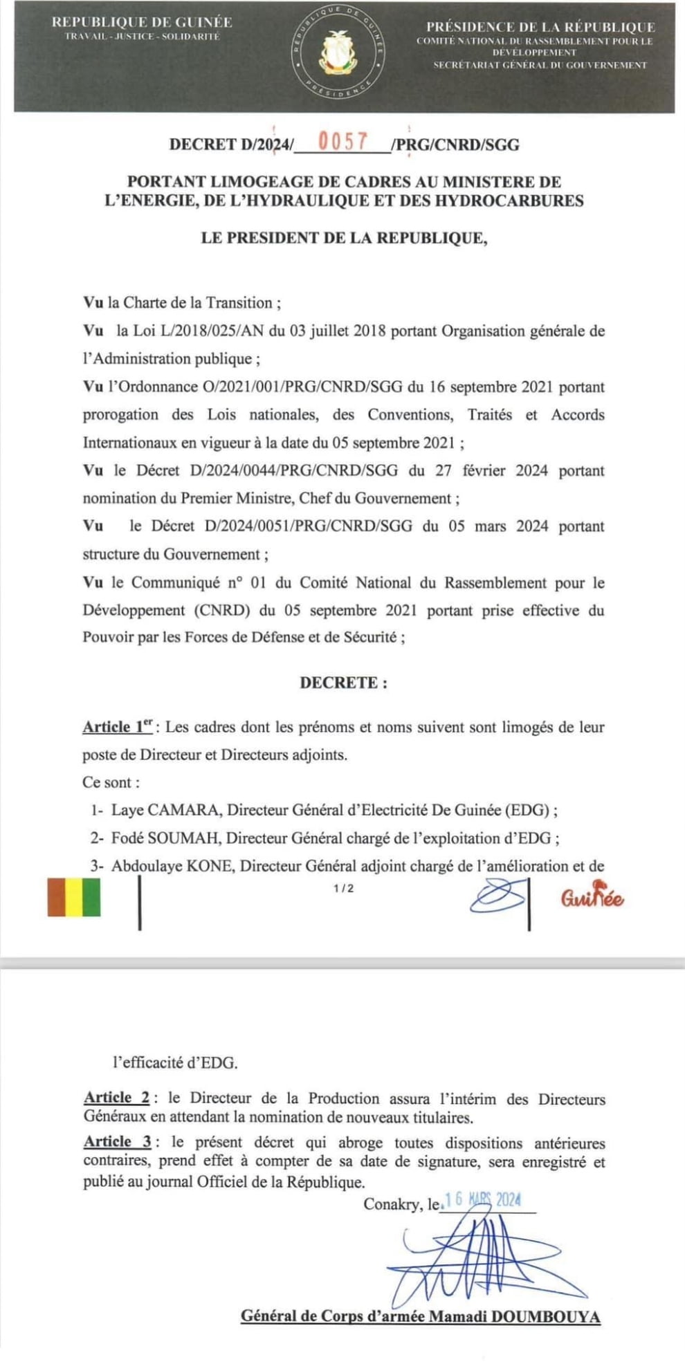 Enfin, les Directeurs Généraux de la SONAP et de l’EDG limogés par le Général Mamadi Doumbouya (Décrets)!!!