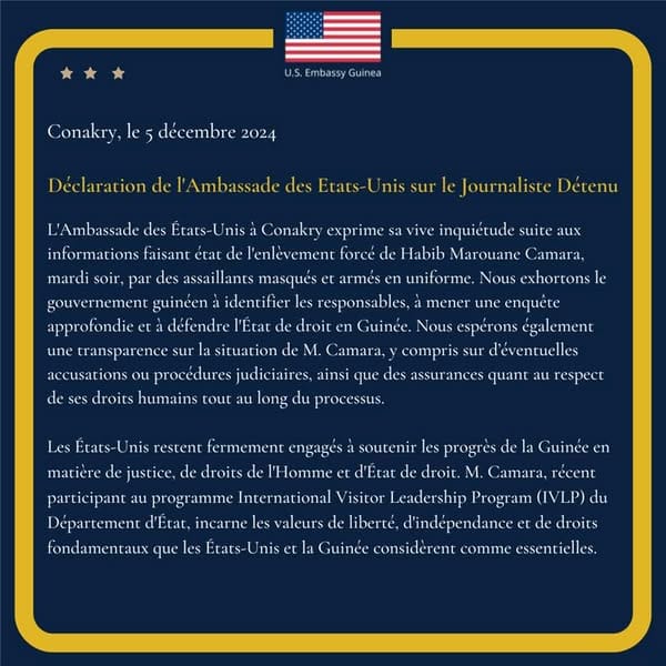 L’Ambassade des États-Unis en Guinée a dans une Déclaration en date de ce jeudi 5 décembre 2024, exprimé sa »vive inquiétude suite aux informations faisant état de l’enlèvement forcé de Habib Marouane Camara ». Par la même occasion, elle »exhorte le gouvernement guinéen à identifier les responsables, à mener une enquête approfondie et à défendre l’État de droit en Guinée.”