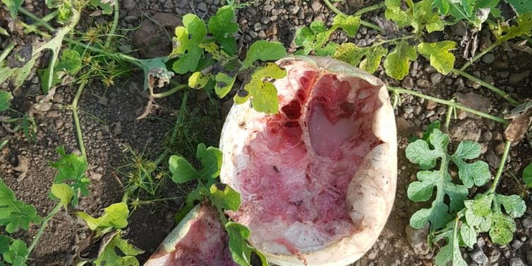 Selon nos informations, les faits se sont produits il y a maintenant près d’une semaine. Dans le champ de Mamadou Diouma Bah, les pastèques découpées sont visibles un peu partout. C’est la forfaiture des personnes inconnues, regrette le jeune entrepreneur.