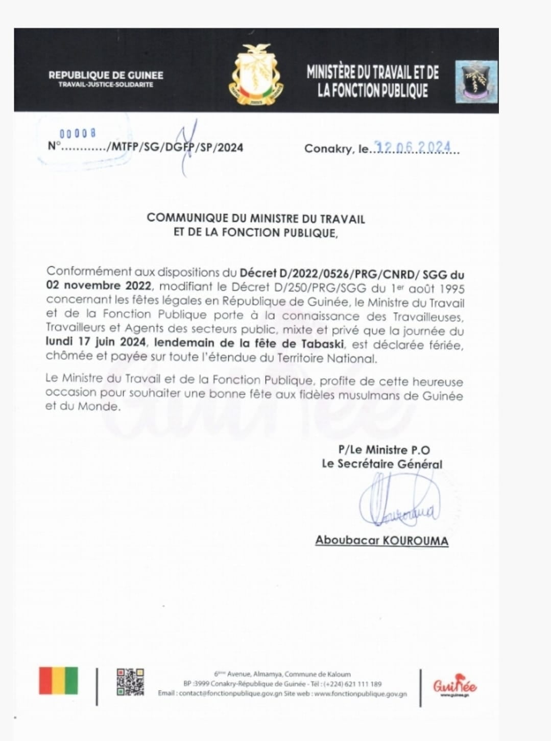 Fête de Tabaski : La journée du Lundi 17 juin déclarée fériée, chômée et payée (Communiqué) !!!