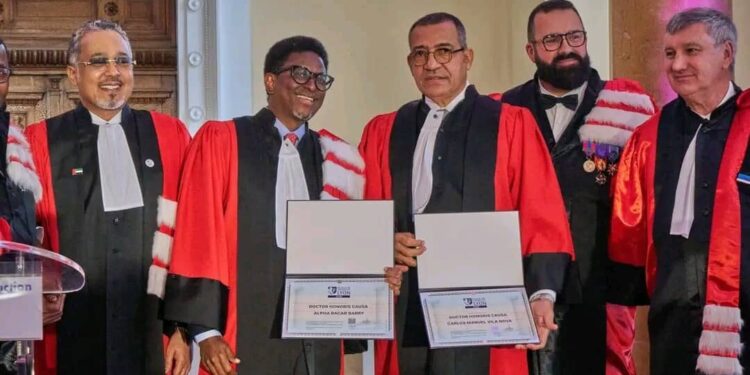 Ce prestigieux titre de Doctorat Honoris Causa, décerné par l’École de Commerce de Lyon, a été attribué à Monsieur le Ministre Alpha Bacar Barry en reconnaissance de son engagement exceptionnel dans le développement du système éducatif de la République de Guinée, ainsi qu’à Son Excellence Monsieur le Président de Sao Tomé et Principe, Carlos Vila Nova, pour son engagement dans la transformation structurelle de son pays.