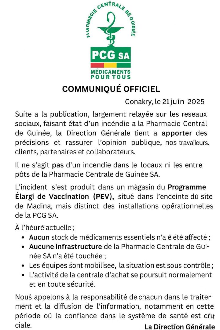 Suite à ces informations, la direction générale de la pharmacie centrale de guinée, a à travers un communiqué apporté des précisions.