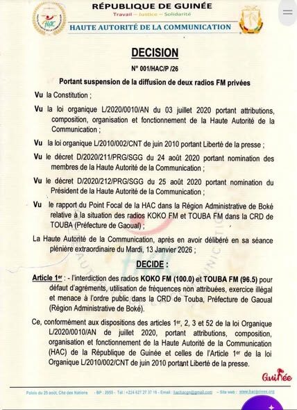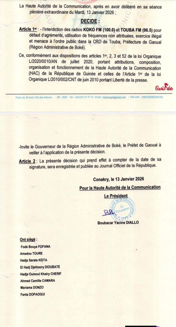 La Haute Autorité de la Communication (HAC) a ordonné la suspension immédiate de deux radios FM privées opérant dans la commune rurale de Touba, en préfecture de Gaoual (région administrative de Boké). Il s’agit de KOKO FM (100.0) et TOUBA FM (96.5), mises en cause pour plusieurs manquements graves à la réglementation en vigueur.