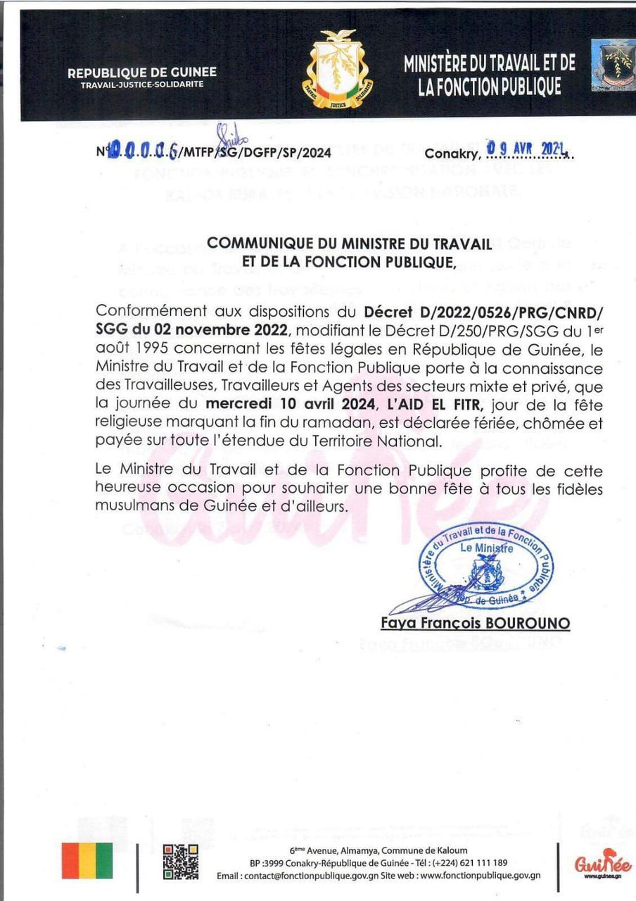 Guinée: Fête de l’Aïd El fitr, la journée du mercredi 10 avril déclarée fériée… (Communiqué)!!!