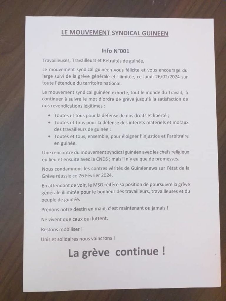 Guinée : ‘’la grève générale continue’’ malgré l’implication des leaders religieux (Communiqué Mouvement syndical) !!!